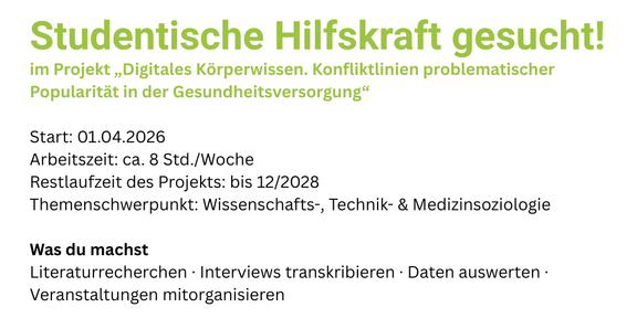 Zum 01.04.2026 suchen wir an der Professur für Wissenschafts- und Techniksoziologie im Drittmittelprojekt „Digitales Körperwissen. Konfliktlinien problematischer Popularität in der Gesundheitsversorgung“ (Projektlaufzeit: 01/2025-12/2028) eine studentische Hilfskraft (m/w/d) mit einer Arbeitszeit von ca. 8 Stunden/Woche.